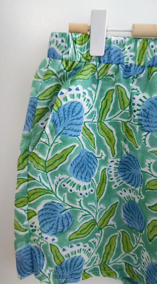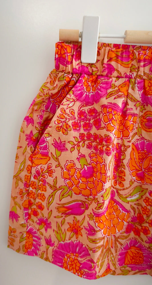 Le short ZELIE est confectionné dans un voile de coton indien imprimé à la main aux teintes végétales lumineuses. Sa coupe courte et fluide, sa ceinture élastiquée avec lien à nouer et ses poches latérales pratiques en font un essentiel de l'été.
